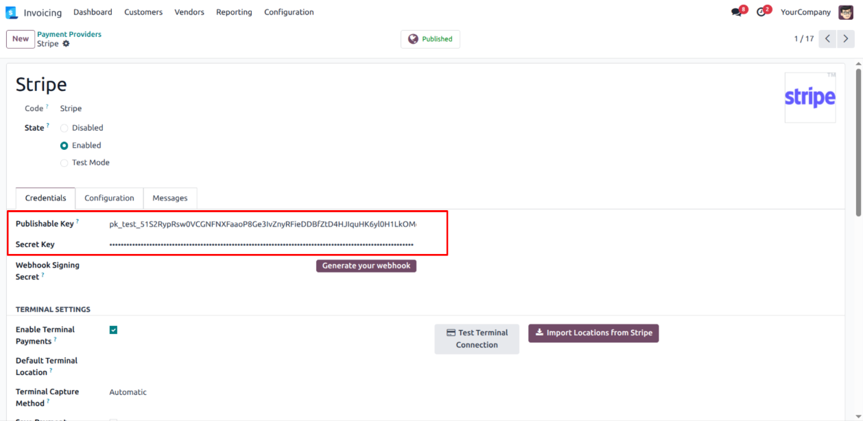 - Now also you may select a default terminal location on the stripe provider configuration page.