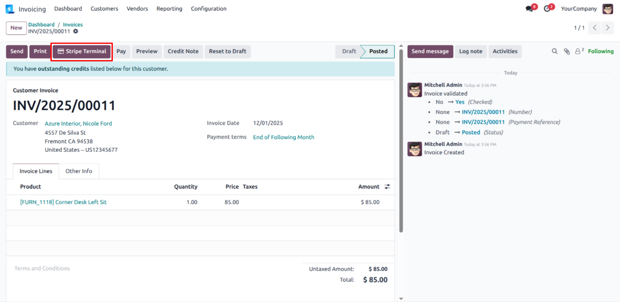 - Open a posted customer invoice. a Stripe Terminal payment button will be visible.