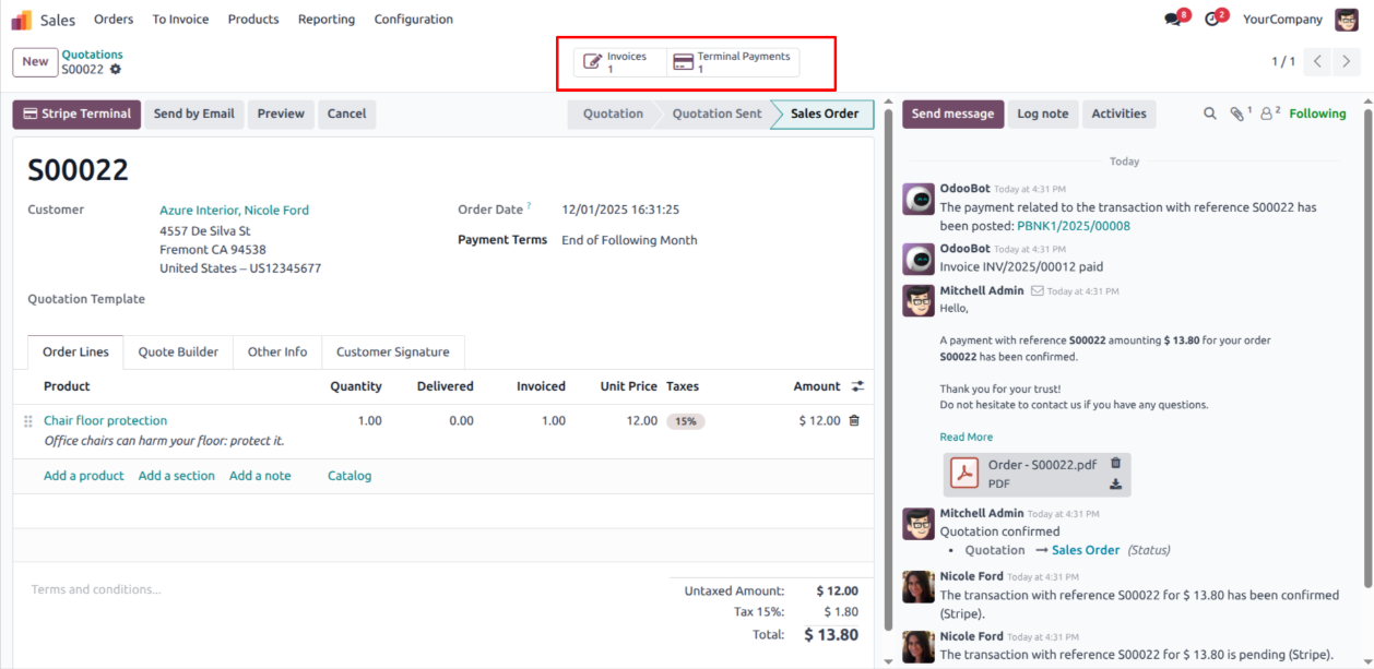 - The successful transaction automatically confirms the SO, creating the invoice and reconciling the payment against it.