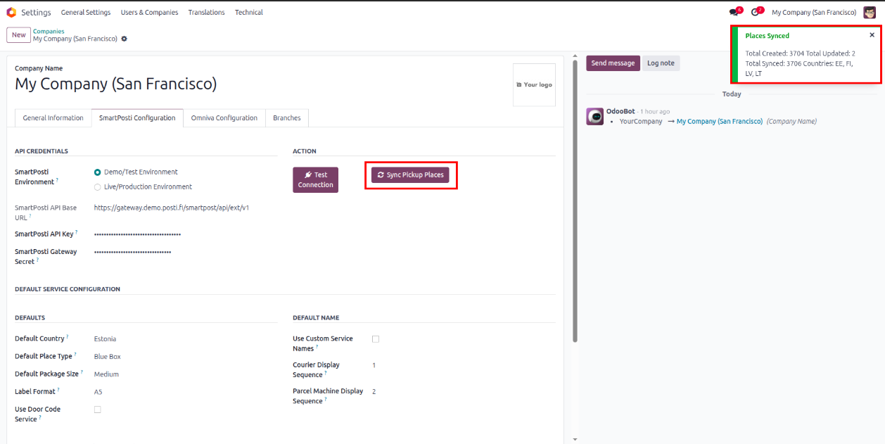 - By clicking on Sync Pickup Places button you will get the smartPosti places from smartPosti to odoo showing a success message notification.