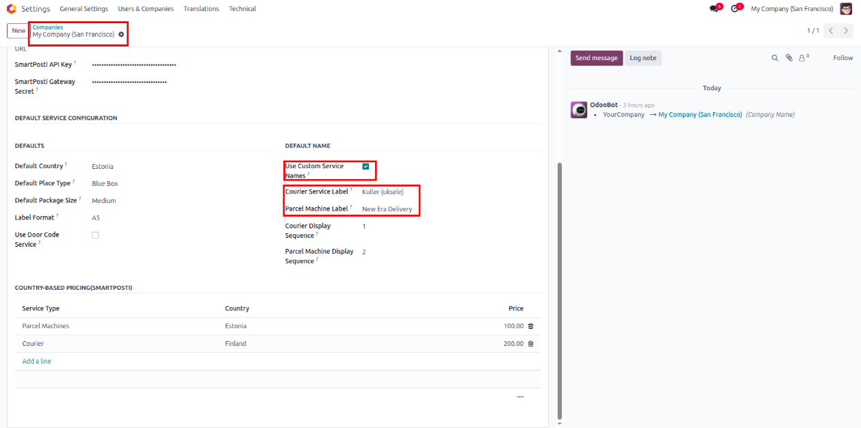- Also, user will see fields Courier Service Label & Parcel Machine Label when enabled Use Custom Service Names under Default Name section of company page SmartPosti Configuration.