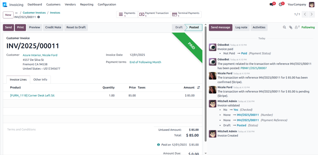 - The successful transaction automatically confirms the SO, creating the invoice and reconciling the payment against it.