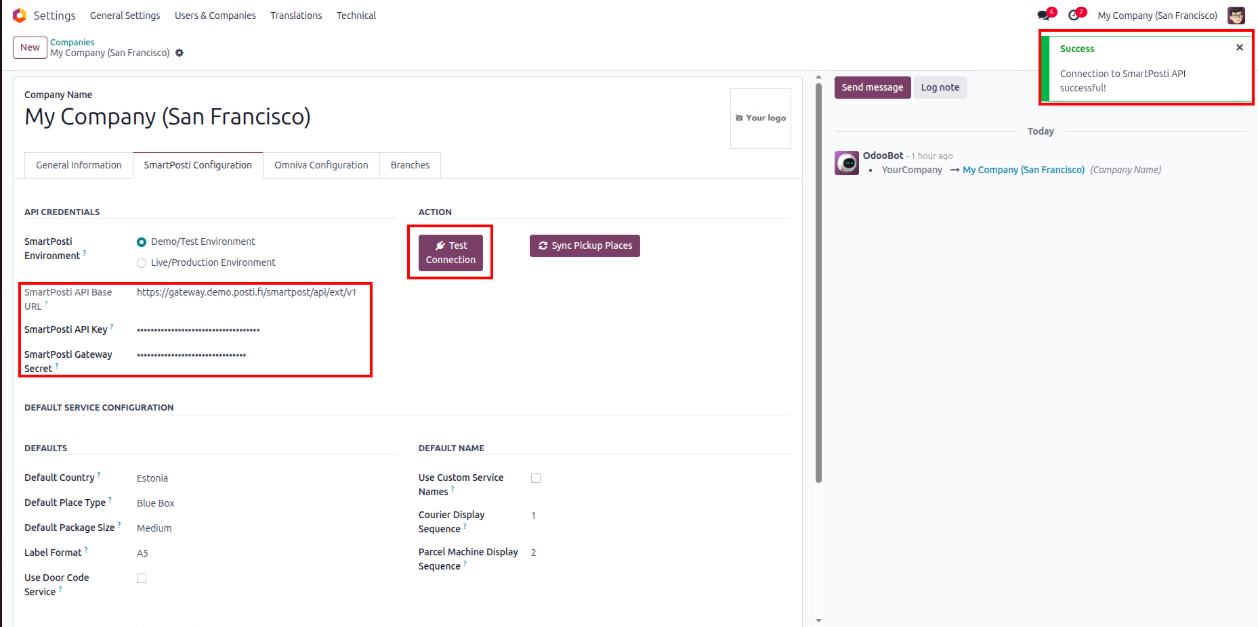 - By clicking on Sync Pickup Places button you will get the smartPosti places from smartPosti to odoo showing a success message notification.