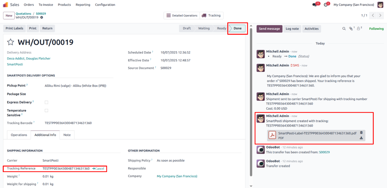 - Retrieve the Automatically generated Shipping Label and Tracking number in the delivery order.